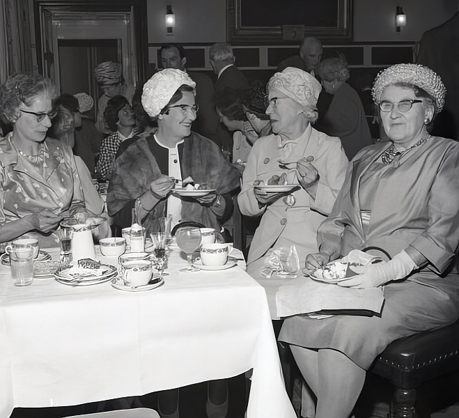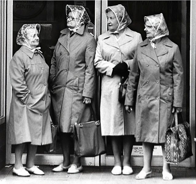 We asked one of our few remaining corsetiere friends about these snapshots from the early 1960s. The colour photo is a still from a 1962 wedding movie. "What were these women likely to be wearing beneath their smart suits and dresses at that time?" Her answer came quickly for the black & white photos "Corsets or girdles. It's hard to tell which without seeing them move, but there's no doubt that proper foundation garments would be worn." "If I had to guess, and you get quite a good idea after decades in the business, the ladies sitting would be girdle, girdle, corset and corset." I asked if panty-girdles might be worn and our friend regarded me coldly. "This is not America! Panty-girdles didn't come to England before the late 60s."