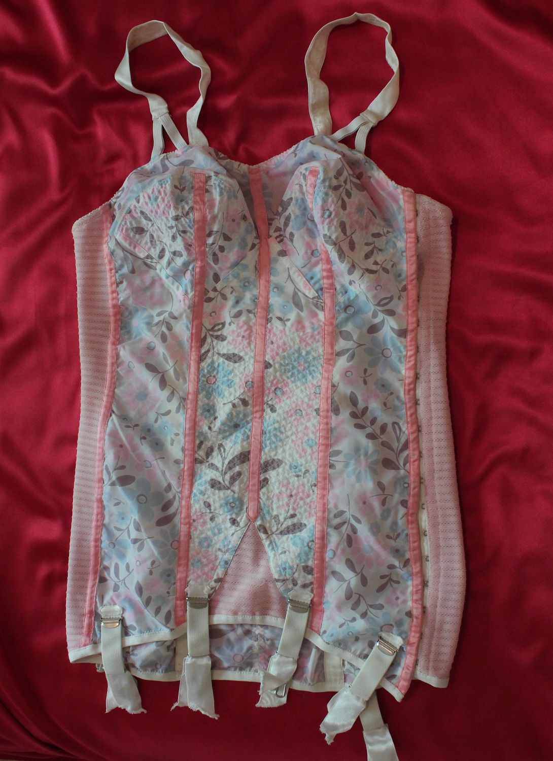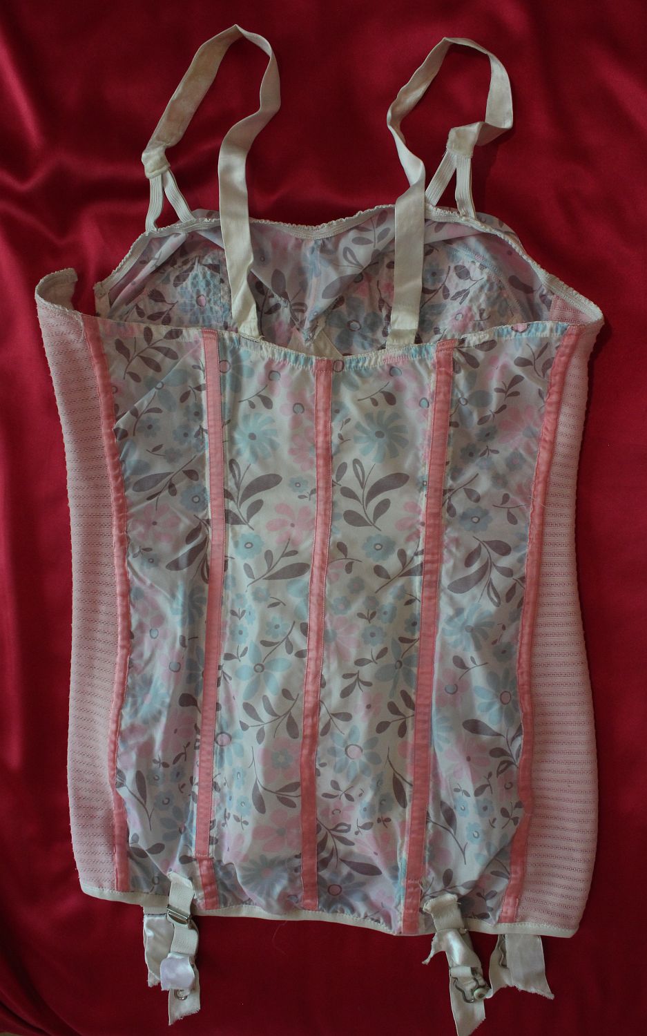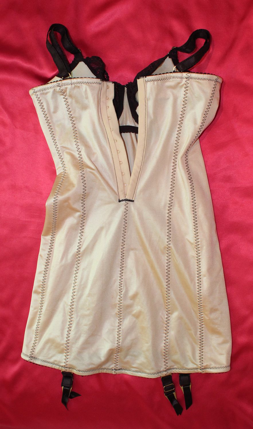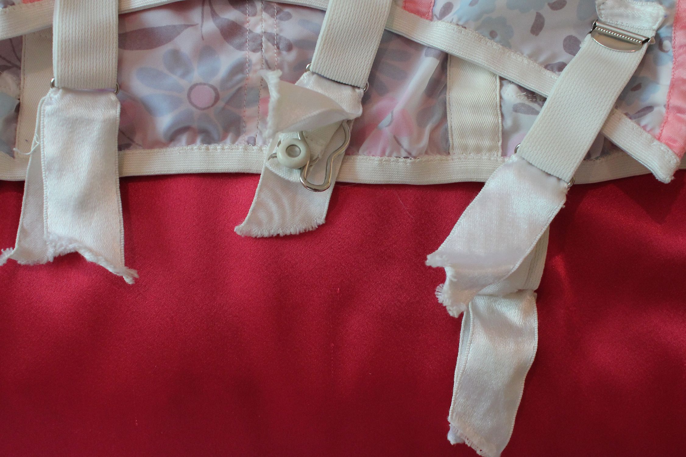 (nylon satin). Four suspenders. It fastens with hooks-and-eyes overlaid by a