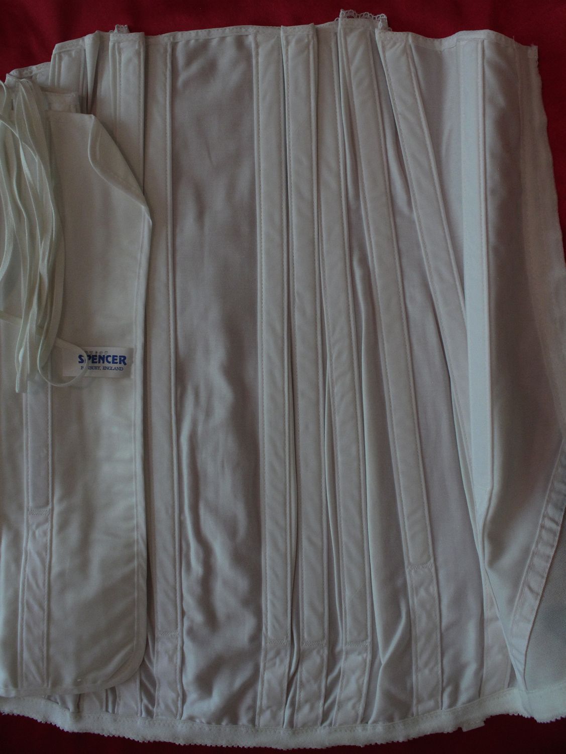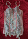 with the metal-pinned knob) with satin flashes. Victoria is a size 10 and it fit her perfectly. It is lightly boned at the back. 17 inches from mid-bra to bottom hem. £50 + postage |