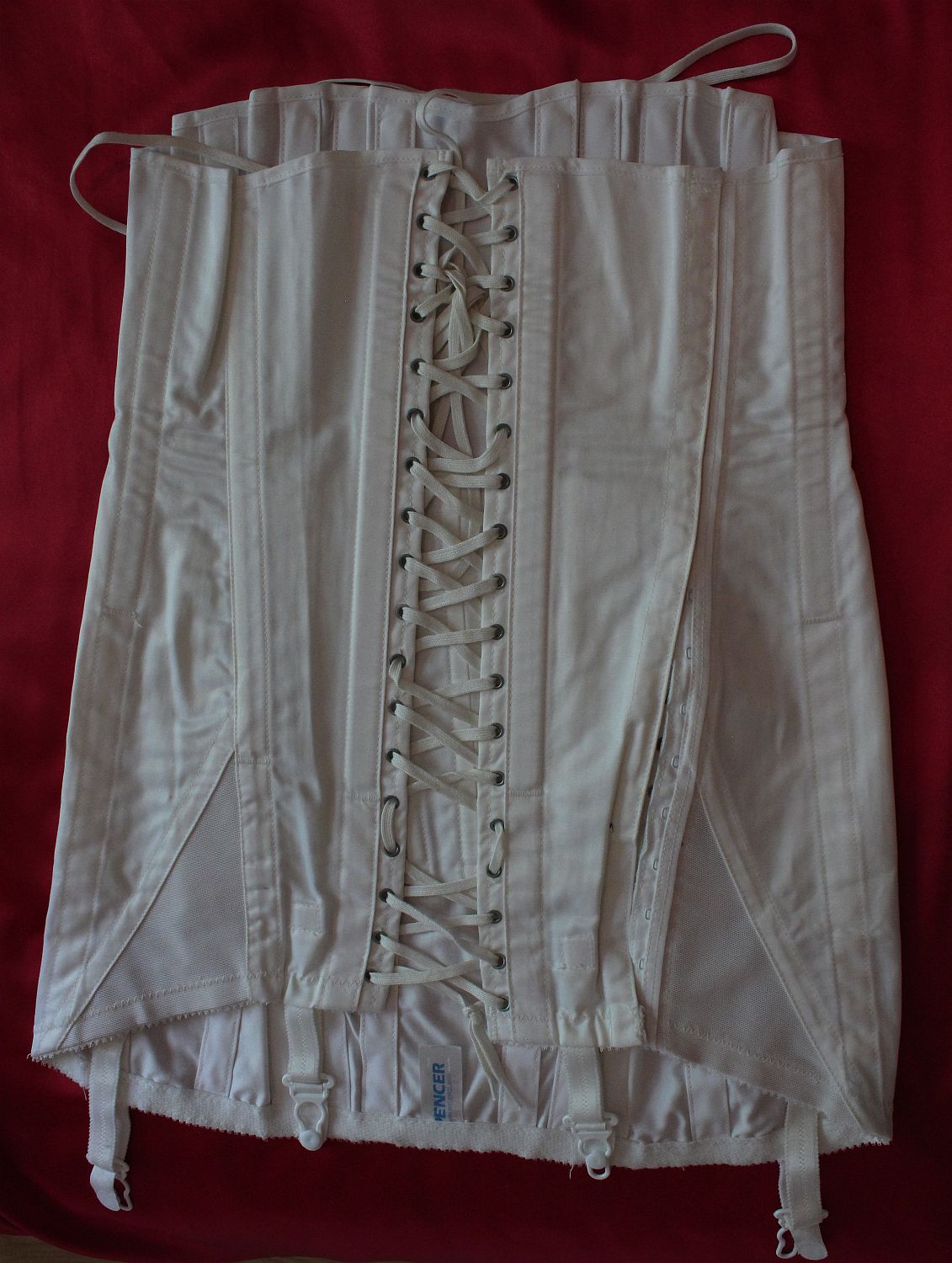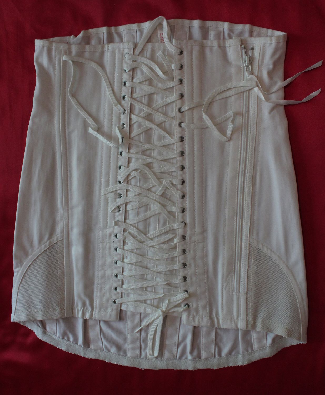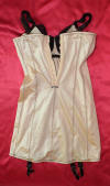 (nylon satin). No suspenders. It fastens with hooks-and-eyes overlaid by a