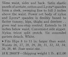 The popularity of girdles rise and fall over a three decade period, the shortest of any serious foundation garment. What might have been a longer success was squashed in short order by the panty-girdle. This garment first appears pre-WWII but dramatically dominates the catalogues as the 1950's come to an end having evolved into the long-leg panty-girdle. For two decades, American women wore a bra and panty-girdle; it might as well have been a uniform. Incidentally, Sears never used the term panty-girdle, simply panty or girdle.