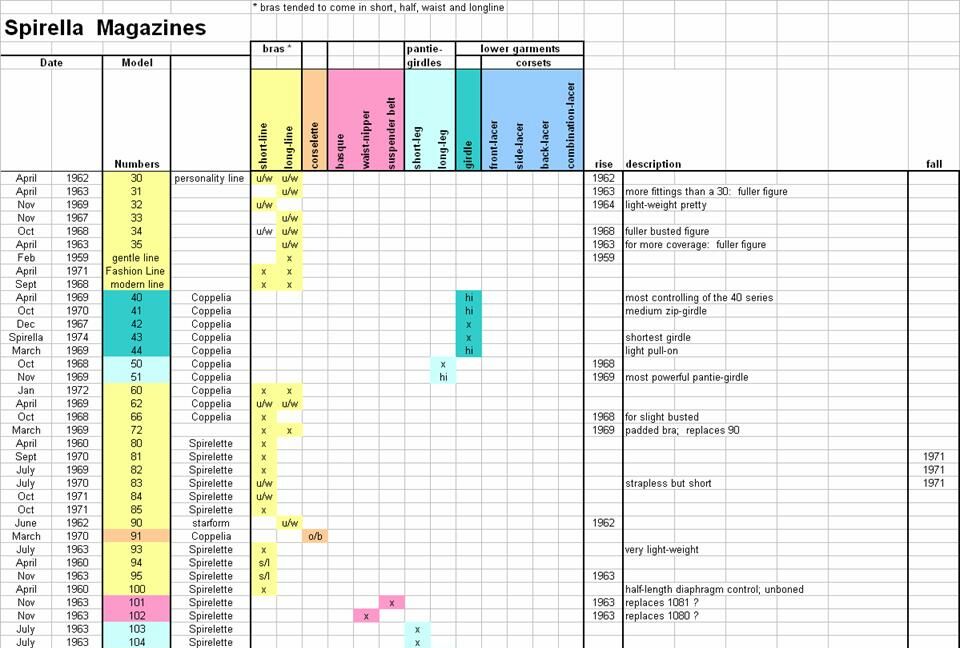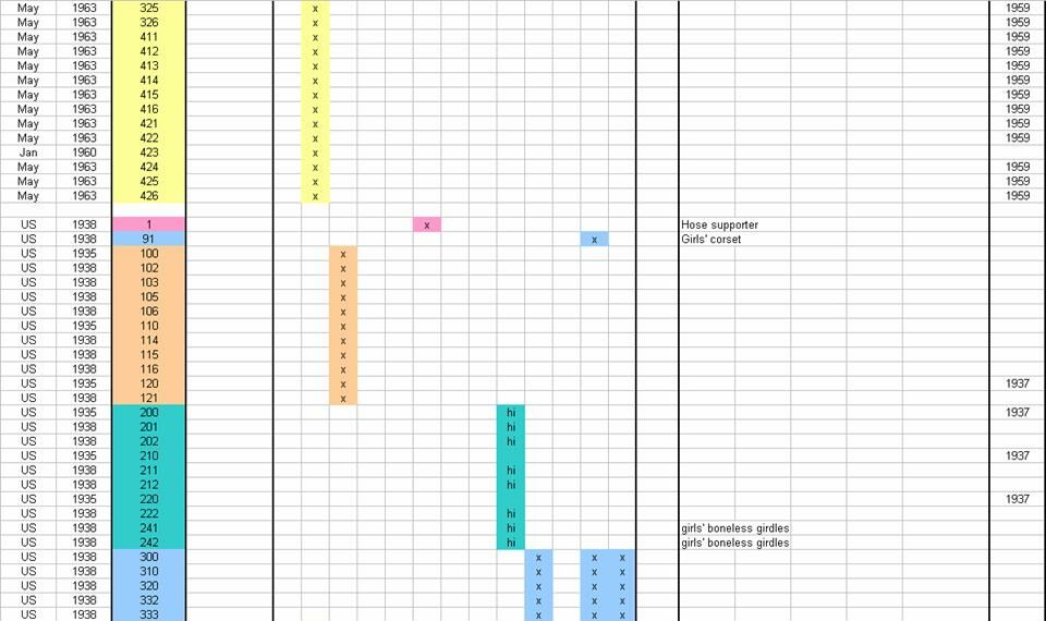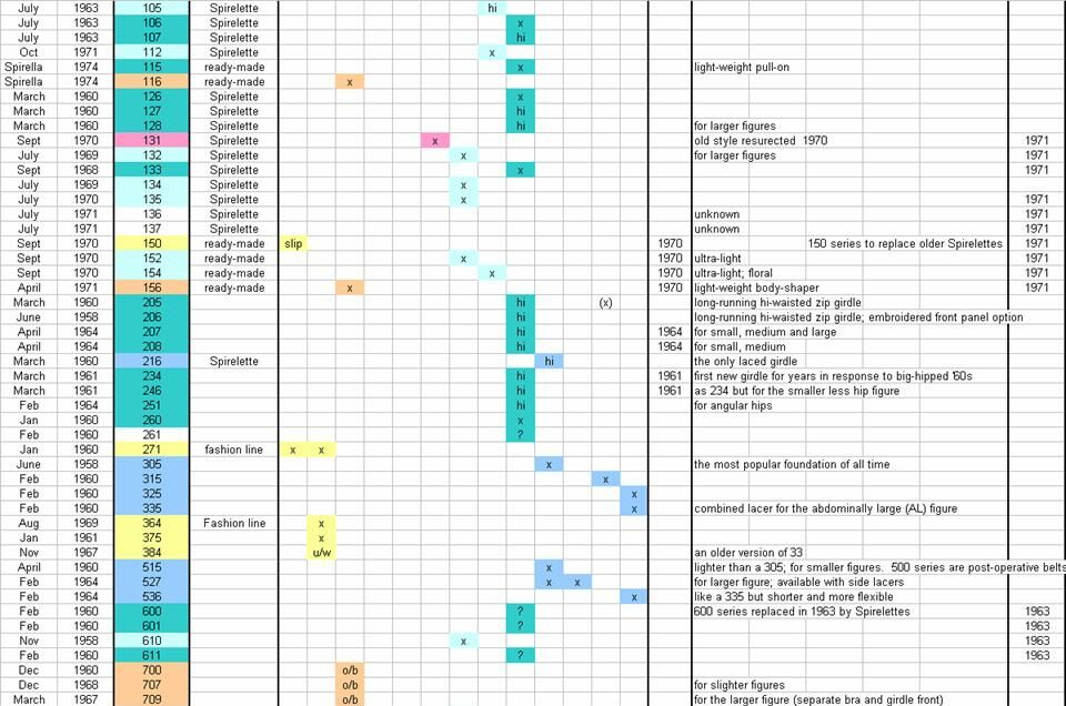 The 2 and the 3-series nomenclature would stand the test of time, however, confusion arose when America and Europe's numbering system started to diverge just before the war. In the 1960's in Britain, the 1-series was adopted for panty-girdles since the marketing department felt that 1 was perceived as lighter than 2 that was, in its turn, lighter than 3! The corselettes were relegated to number 7. We undertook to note as many designations as possible and they are tabulated below, however, with the divergence of America and Europe, this list cannot be considered compete or even totally accurate!