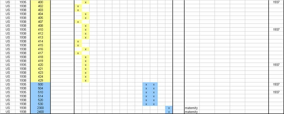 Spirella developed its famous numbering system well before the Second World War and stuck with these numbers, albeit with a few modifications, until the end. In their American fitter's catalogue of 1938, the numbering system is well established although it has not yet achieved the complexity that would follow after the war. The catalogue contains page after page where the styles are shown for slender, medium and stout figures. Maternity and abdominal are also covered as well as, unbelievably in the 21st century, a section on corsets for young girls. We have shown just a few of these pages below to illustrate the fundamentals of the numbering system.