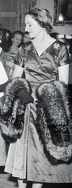 Thank you very much to the eagle-eyed Royalist who has identified the striking lady above. She is Pamela Margaret Elizabeth Berry, Baroness Hartwell (née Smith, 1914 – 1982), an English socialite, known for her political salon. She also presided over the Incorporated Society of London Fashion Designers and was active in the British section of the Franco-British Council, working to promote British fashions internationally, hence her presence with the Queen Mother during fashion shows.