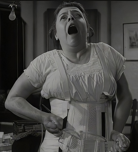 "The stout matron grimaces rather than smiles. If you had seen the effort that it took her to lace tight that unaccustomed corset, you would not be surprised at her expression. Her eyes bulge, her bosom is hoisted inches higher than even Howard Hughes intended by the hip-quenching force of her formidably over-tightened stays. Her corsets have removed her feminine hips and she tapers like a female tent-peg into the arrow-head agony of her stilettos."
