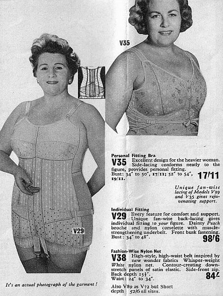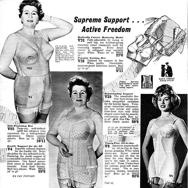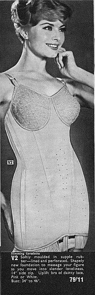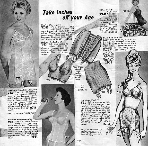 This just about summarises their late 1950s collection. Corsets, girdles, invisible lacing and rubber, but no panty-girdles, not yet.