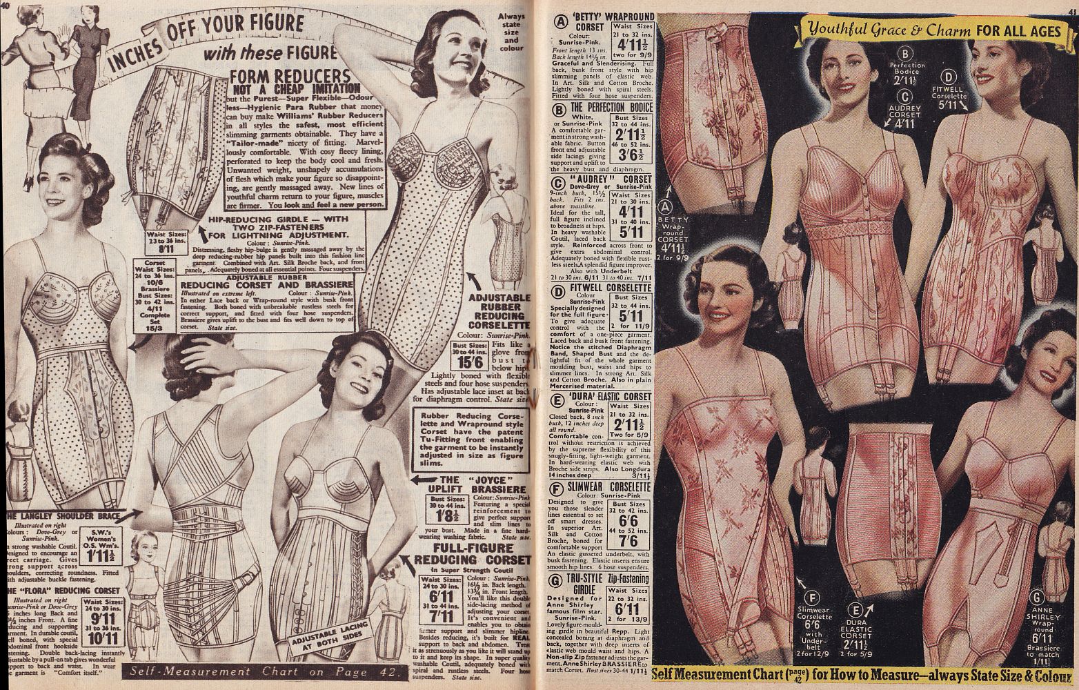 And if that didn't work, one could always swelter away in a rubber corset and brassiere (far left - 1939; right - 1955). Alstons, the manufacturer of these garments might have had trouble selling them, but AW managed to move quite a number of these articles. The model above holds a rose to her nose. Although this is a classic corsetry pose, one can't help feel that the scent of the rose is being used as an antidote to the pungent smell of the rubber corset. |