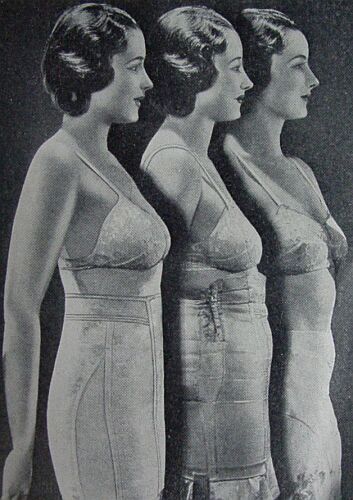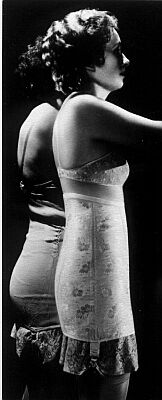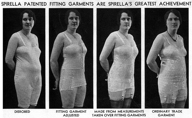 These photographs from 1930 are perfect examples of the Spirella principle. The photographs are very similar, but the Spirella on the right is not compressing, as the giveaway folds of fat under the arms are not present. The abdomen is allowed a slight bulge, the contours are smooth and the woman probably really does feel the improvement. To a professional couturier or corsetiere the pictures above will ring true; however, from a marketer's point of view, they would end up in the bin!