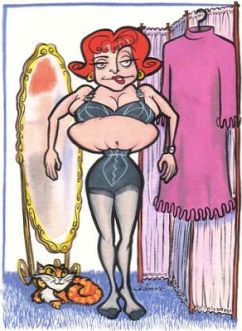 My husband refers me to a cartoon that one of his frivolous colleagues must have sent to him. It does, however, illustrate the exaggeration of the advertisement on the left. (At my express request, he edited out some parts that might be considered offensive). On the right is another impossibility that cartoonists love, however, it does illustrate the truth that flesh cannot be compressed, it can only be redistributed!