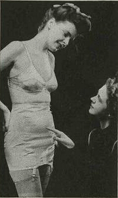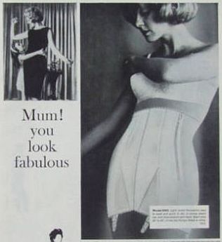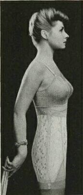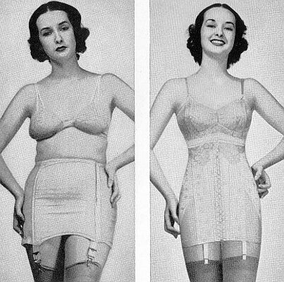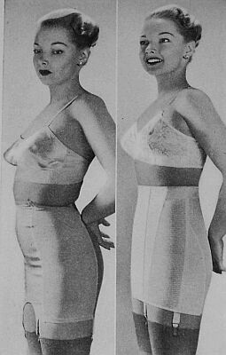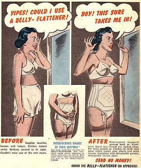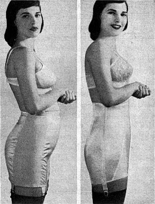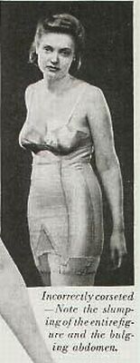 Even in the late 1950's when we were supposedly more sophisticated comes another girdle admonishment. Certainly, the boning in the front of the girdle will cure that bulging (note the word) abdomen, however, the bulging flesh squeezed between the brassiere and the girdle seems to have vanished ! |