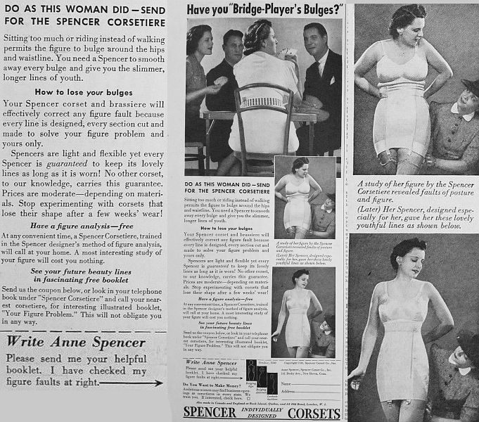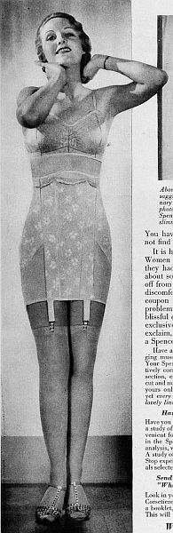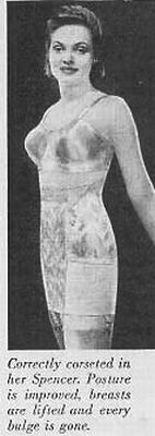 Spencer 1941: The Spencer supporting corset is prescribed for dropped stomach, hernia, floating kidney, varicose veins, chronic coughing, arthritis, faulty posture. Smoothes away bulges, relieves backache, headache, nervousness, indigestion, constipation, poor circulation and faulty breathing.