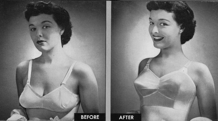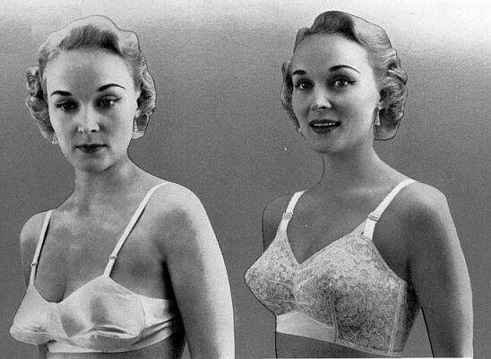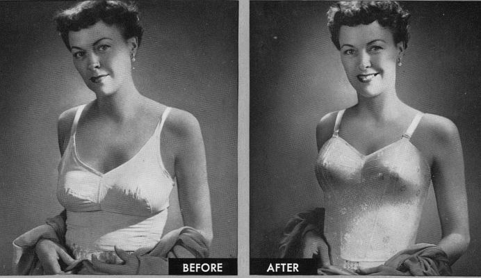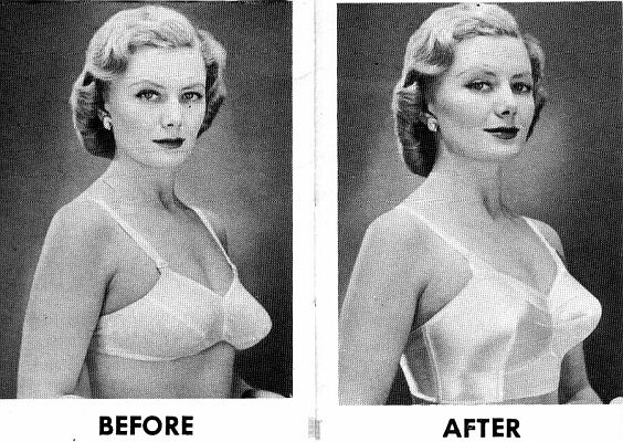 In 1958, the lady in the middle has almost dislocated her right shoulder in an attempt to portray the sagging breasts suspended in the pretty satin brassiere. Again we are reminded just which photograph is which. I love the smile on 'after' woman; it is so smug. She must be delighted that her breasts ride on an even keel with her new brassiere. It was a common photographer's trick to loosen the strap on the profile breast to cause this alarming droop.