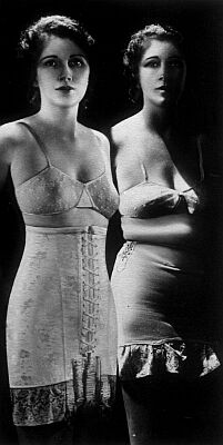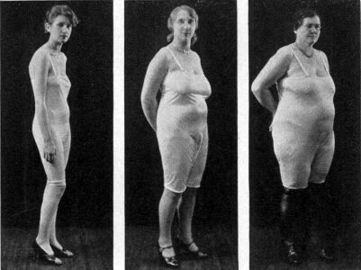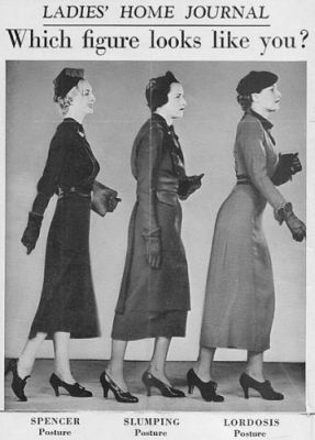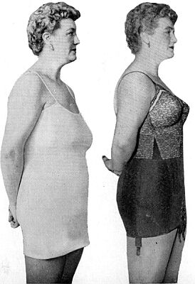 As for the 'before and after' models below left, a huge emphasis was put on the postural condition 'lordosis' (sway-back in horses). In fact, far from atrophying stomach muscles, surely the opposite was true since such an arching of the back takes considerable skill!