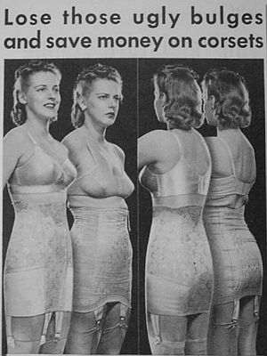 Herman Wouk even uses the word in his classic tale 'The Winds of War' (1971). There's a passage from about 1940 where Captain Henry is distracted by his wife, Rhoda, complaining in their bedroom. “Hook me up. Look how my stomach is bulging," and then, "I'm bulging a FOOT. I look six months' pregnant. I'm horrible. And I'm wearing my tightest girdle. Oh, what'll I do?" cries the wife of Pug Henry. Her husband sees no difference from normal but wisely declines to comment. There you have it all: the woman's attention to detail (real or imagined) and the unobservant husband wondering what on earth she is worried about. Fertile grounds for the corset manufacturer.