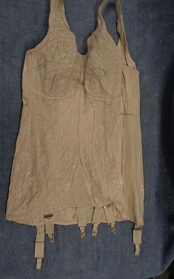 The corset appears to be vintage but this is unlikely since the suspenders are very 1960's in design. It's a charming attempt either by Camp or by the client to soften the otherwise functional design of the garment.