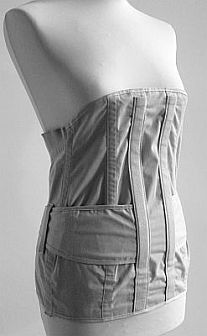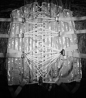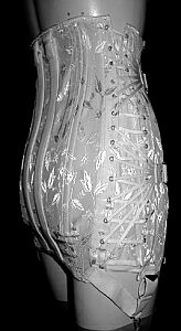 This lead to the rather strangle looking surgical corset (right) complete with all the bones and steels necessary for it to achieve its function, the whole contraption held together by a virtually transparent fabric.