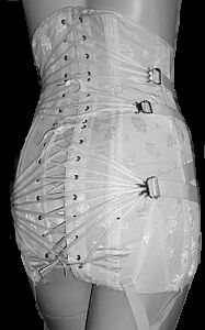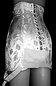 Another superb example (CT) of a classy and feminine material overcoming the serious intent of the garment. Note on the right that CAMP did produce some corsets with conventional lacing (VGP) but this was not the norm and these garments are now rarities.