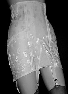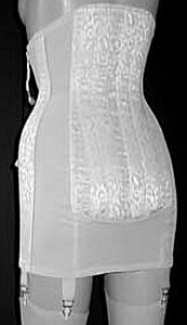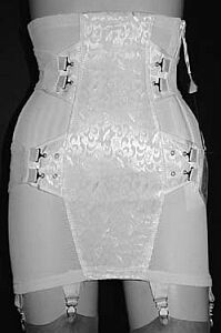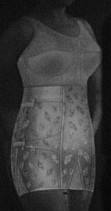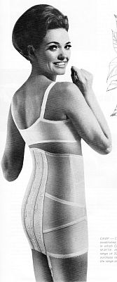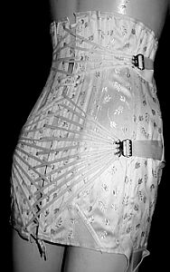 The Camp girdle combined elastic panels with attractive materials and the 'Adjustaband Control'. Again, like the corset, the hooks of the bands stand proud and talking to women who have worn the girdles, the variable positioning of the bands is merely like the rows of eyes on a brassiere. It serves to accommodate the slackness of the elastic with age. However elegant the girdle on the right (above) appears, I doubt if it could ever be as functional as a real corset. Look at the expanse of thin elastic between the rigid back panel and the front.