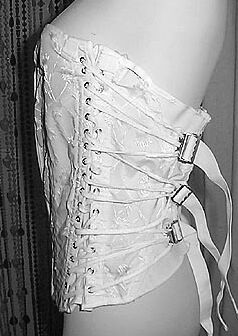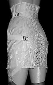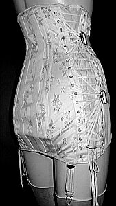 Acknowledgements: Throughout the text in this article, I had intended to use illustrations from our own archives. However, I soon realised that these archives had completely missed some of the most beautiful and elegant corsets procured by the vendors that sell via Ebay auctions. These garments were quite an education to me and this page would be a far poorer place to visit without them. I would like to thank Cherry-Tomatoe, Lyn Locke, and Trishypoo for their generous permission to use these photographs. I have tried to credit the photographs accordingly using their initials. Their web and auction sites are a wealth of information for a researcher who believed that such garments existed only in her memory and the few remaining catalogues of that period.