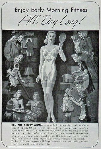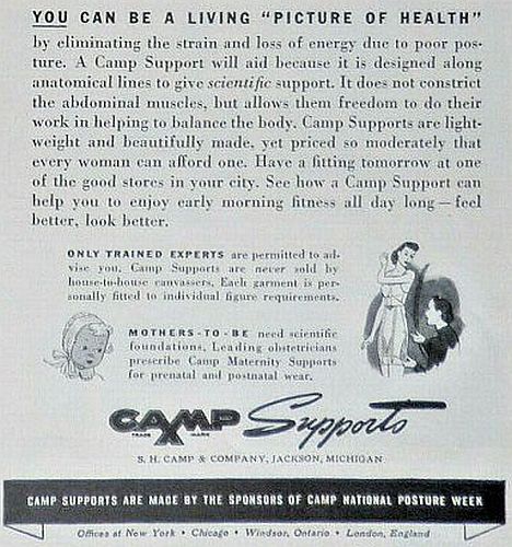 Typically of the period, 1941, CAMP extols the virtues of their scientific support whilst extolling the virtues of the wearer, for without her corset, she would not be able to contribute to society.