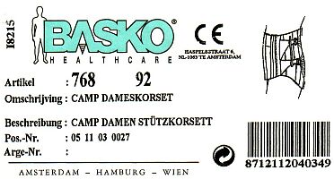 I have no idea how this affected the finances of the Camp company; however, they still exist today and thrive in the surgical appliance market. The 1996 brochure shows the descendants of the traditional Camp corset and girdle, albeit in beige and notably in Dutch. Camp must have joined forces with a company called Basko, and the names Basko, Camp, and Basko-Camp are marketed in Western Europe and Scandinavia, but no longer in Britain. The latest web catalogue reveals that the traditional fan-lacing lives on in a wrist support, but its use in proper corsetry has died some 94 years after its invention.