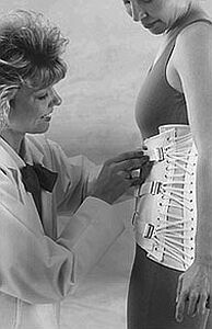 Another strong support with triple side-lacers and a slightly dished front panel for the abdomen (CT). These are corsets from the 1970's and the durable rather than fashionable nature of the material indicates their intent precisely. I purchased an identical corset in Holland in 1986 and it featured in their brochures until recently |