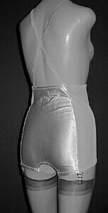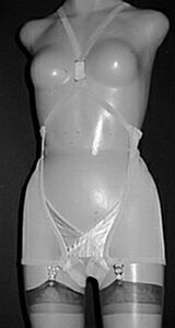 Possibly the most outlandish creation that we have encountered, is a girdle designed for pregnancy. It performs a sort of 'Jeckyl and Hyde' function, where the rear is confined into the 'mono-buttock' sleekness required in 1960's America, whereas the tummy is literally allowed total freedom which, I would have thought, precluded wearing the skirt encouraged by the other side of the contraption.