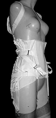 The Camp maternity corset (CT). The swing rear suspenders and the five hole former are hallmarks of this brand. The corset on the right has, perhaps, gone a little too far to accommodate the expanding womb. Four sets of lacing (two on each side) take up so much of the corset that it's even hard to make the photograph show all the complexity. |