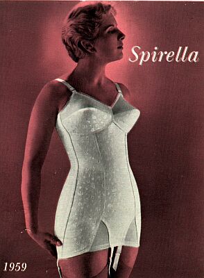 Spirella made corselettes for much of its history although the traditionalists might prefer the combination of girdle or corset and long-line brassiere. Indeed, in a similar fashion to Spencer's Spen-all, Spirella also made a corselette that was in one piece at the back but came round at the front to form a separate brassiere and girdle or corset section as shown below.