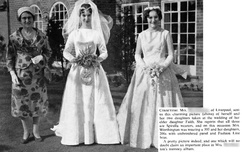 It is the 1960s, that decade of social upheaval and turbulence, the ramifications of which are still being felt today. In the 1950s, so many girls were carbon copies of their mothers who tried to protect their offspring from the 'evils' of rock and roll. They failed and with the advent of the Beatles, the social revolution began which, to the horror of Spirella, ended with the demise of lower foundation garments in general. There are eighteen ladies present here, whose ages range from 24 to about 70. This means that some of the older ladies were born around the turn of the century, whilst the brides and bridesmaids would have been born at the end of the Second World War. Ten are wearing corsets, seven are wearing open-bottom girdles and one daring young thing is wearing the new-fangled (in Britain anyway) long-leg, pantie-girdle. The preponderance of corsets, indeed, the foundation garments being worn is not necessarily typical of the era but might have been typical for a wedding party. However, bear in mind that Spirella had a vested interest in promoting structured underwear and these articles all come from the Spirella in-house magazine. I remember being present as a bridesmaid at a wedding in 1967 and I knew that my aunt wore a corset, my mother and myself wore girdles, although mine was an un-boned roll-on, I mean how else would you keep up your stockings?