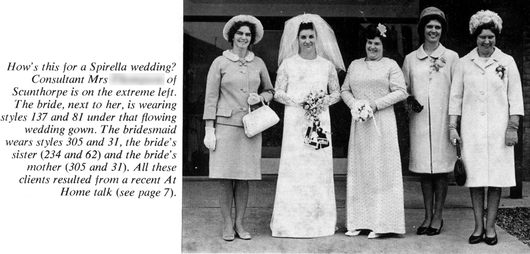 An exciting day for the bride and a proud moment for our consultant Mrs. H. of Peterborough. The bride wore Spirelettes 83 and 132 , the bridegroom's mother (on her left), a Coppelia 44 and Modern Line bra; sister of the bride (extreme right of picture) wore a 305 and Fashion Line bra, and (on the bride's right) her mother in a 325 corset and style 72 bra, and Mrs. H. in Spirella foundations 305 and 30.