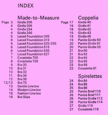 Made-to-Measure The made-to-measure foundations (left) comprised brassieres (called bandeaus by Spirella until 19**), corsets, girdles and corselettes. Each of these generic garments has a page with descriptions in far more detail. Title page and back cover |
