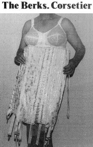 Now was not the time to lose courage and ignore the compulsion to pursue the corseted life had inspired my efforts After a diffident exchange of pleasantries - thanking for good directions, etc. - on both our parts, I followed mine host into the house. He showed me to a low sofa. The obvious difficulty I had in sitting meant, if nothing else that “the ice” was well and truly “broken” since it was evident to him, who knew my secret and as I casually as I could admitted that the corsets I was wearing were indeed very long and very tight. In contrast my host sat down with ease and I could not tell if he was already corseted. If he was, based on the evidence of the photos I judged that he would be wearing classic Spirella style corsets - the long skirted versions of which allowed the wearer’s hips and bottom to “slide around” within the corset skirt as they moved to sit down. At least that’s how the theory goes but it still depends on the attendant strain of the hem of the skirt being accommodated by suspenders with elastic strong enough and, by stockings knitted with yarn of sufficient weight.