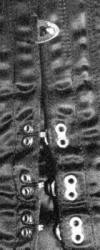 He used the fan lacing corsets to explain about the differences between the Camp and the Jenyns fan lacing designs. Having worn both styles he found the laces on the Camp models he’d purchased didn’t last as long as those on a Jenyns style he had made himself. He thought it was due to the fact that the Camp method the laces, which pass through the holes in the steel plate at the end of the lappet straps, caused more damage to the lace by abrasion than did the lacing eyelets. He had tried putting lacing eyelets inside the holes without success. He preferred pulling in on a Jenyns arrangement. He also explained that with only three holes in the lace “manifold” plate on the Camp design and the fact that it was only possible to thread two laces per hole, the number of lacing eyelets one pair of strap could control was usually no more than ten pairs. Hence the need for at least two and sometimes three lappets to control a longer corset. With the Jenyns style the number of pairs of laces in the cluster manifolds was not limited as shown in the accompanying image with 16 pairs controlled. On the corset he fitted in my presence he pointed out that he had made the lappet “manifold” to control 12 laces over the hips and he closed the lappets with ease. |