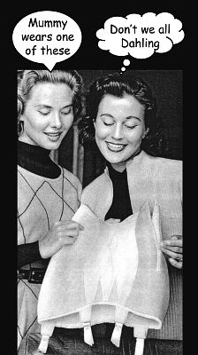 A mother was reading in the sitting room. Through the open window she heard her seven year-old son discussing with his friend, and apparently with quite some knowledge, her own girdles. "My Mummy's got lots of girdles. She wears the really tight one when she goes out with Daddy. You can tell 'cause she walks funny!" Her son's friend was less of an expert but volunteered that 'Gran' wore a corset. Later that evening, she was sufficiently concerned to ask her husband if she did, indeed, walk funnily, and was re-assured that she didn't. But the doubt was always there afterwards!