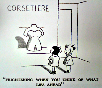 A rare occurrence of lady from the 'horsey set' into the ranks of the corsetičres was not a success. The clientele developed over the years by her aunt, was steadily reduced by the novice's conviction that her clients were as sturdy as her horses and, to paraphrase Tom Sharpe, "She laced and buckled her charges into their corsets with a vigour reminiscent of a race meeting." A corset (95 times out of a 100) is designed to support, not constrict. Our Thelwell refugee did not last long in the trade! |
