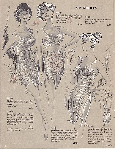 Apart from the frivolous girl wearing the basque, there is little here other than functional undergarments. One can clearly see that foundation garments are on the way out. Note the euphemisms applied to the girdle (highline 152). Although the page is titled 'Zip Belts', they do at least call a girdle a girdle, however, bones are not mentioned, they have become non-roll stiffeners.