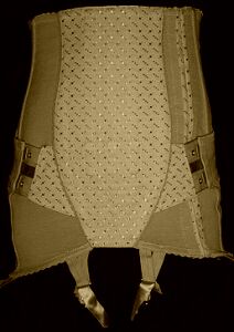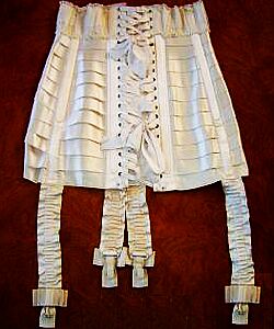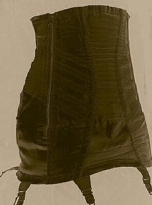 The girdle (above left) is a 1970's Dior that demonstrates the elegant frippery of these garments. The ruffle around the bottom edge, the mandatory satin flashes on the suspenders, and the charming lace details suggest a girdle for a truly special occasion. The 'vestigial lacing' blatantly added on the front is a typical throwback to the days of the laced corset. On the right is a French girdle (1978) from the high street end of the social spectrum, yet, in its rather more functional way, it shares those essential feminine qualities. Regard the minute scalloped lace trim on the top and bottom edges, again the satin flashes, and the satin detailing on the adjustable hip control. Laced and strapped, this is quite a piece of engineering, yet every chance is taken to remind the wearer (and the observer) that the French have style.