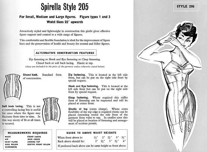 In the same way that the 305 corset was the mainstay of the laced lower foundation, the 205 girdle was a success story that spanned three decades and was a favourite of housewife, diplomat's wife and lady politicians alike. Born out of the Second World War, the design had to change in the late 1950's in response to the better fed and pampered women of a new generation. Rather than change the nomenclature that was associated with a successful product, Spirella moved the elastic gores at the front of the garment and kept the rest, including the name, unchanged.