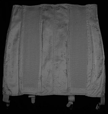A standard 234 girdle is shown above with the 'mystery' girdle below. They came from the same owner; note how the shorter 234 has longer suspenders so that the wearer could use the same length of stocking. The materials are the same, a satin finish brocade and the ages are the same (metal zip and identical suspenders). The construction is very similar, that is unyielding fabric with two vertical elastic sections at the back.