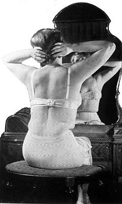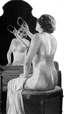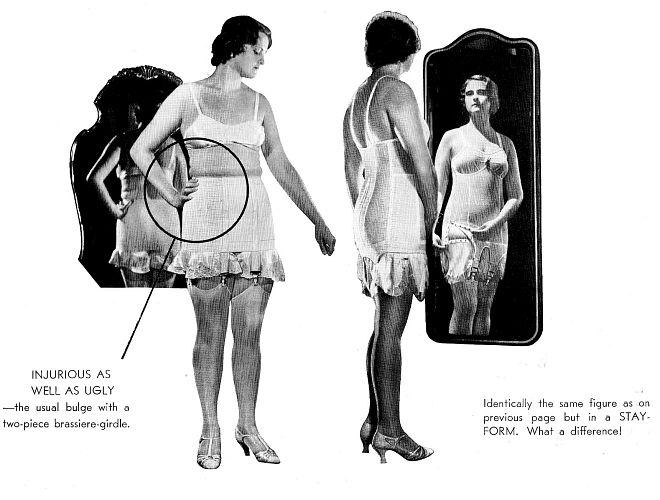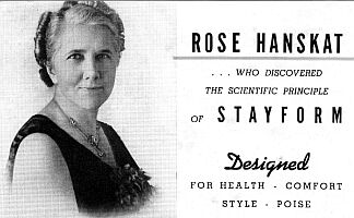 The charming Miss Hanskat hated bones and managed to design corselettes and combination uppers and lowers without them. She felt, as the before and after on the right shows, that a smooth waist-line could be achieved in comfort and that ill-fitting girdles could be positively 'injurious'. One oddity, is that in many of her catalogues, the corselettes are designed to allow the back suspender to cross the side suspender pointing forwards. I've never seen that before or since. |