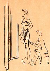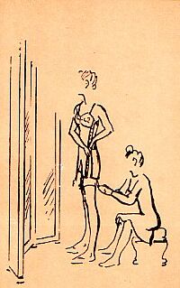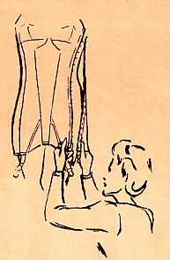 As the trained professional, Mrs. Rogers took charge of all customer fittings, though as many of our clients already knew what they wanted, her role was often reduced to merely checking measurements and congratulating the customer on her most excellent choice. Of course, as most middle age or older women tended to squeeze themselves into the heavier, more complex and expensive garments, she had little financial incentive in steering a customer towards a lighter and cheaper substitute. At first, I mostly served behind the counter, selling lingerie, underwear, stockings and some foundations garments where no fitting was wanted. However, as I gained greater experience, I was increasingly asked to assist in the fitting room, especially with our younger clientele, who it was felt might better accept the opinion of someone closer to their own age, although in truth my instructions were to concur fully with everything Mrs. Rogers said. In particular, I often found myself helping when customers brought their daughters in for that, potentially troublesome, first fitting. Alison's recollection of an occasion when she was asked to make an especially firm control corselette for some young hoyden to curb her excessive boisterousness, reminded me of more than a few difficult first fittings.  |