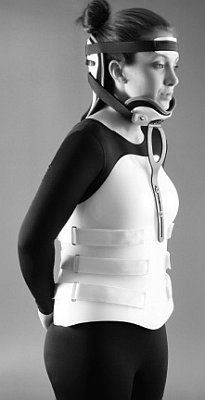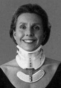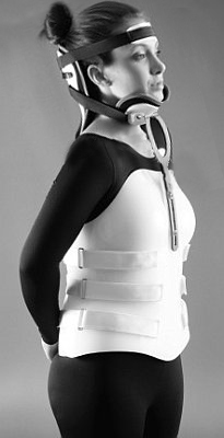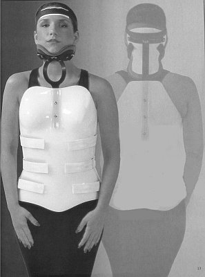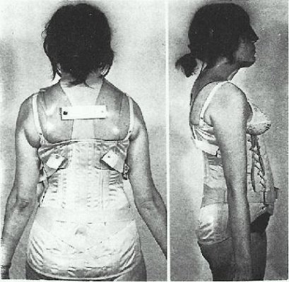 Two women wearing Cervical Thoracic Lumbar Sacral Orthoses; a pretty satin corset that supports a clear celluloid neck support and a pretty girl with a plaster body cast under her summer frock. No neck movement here!