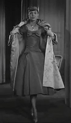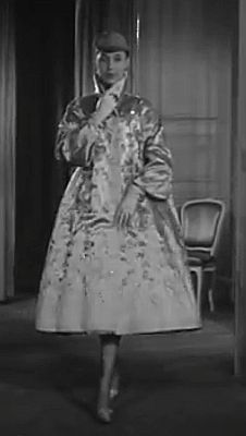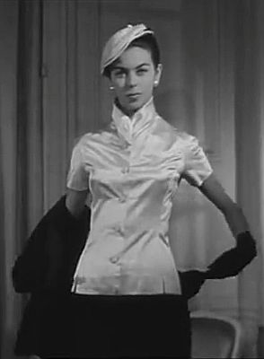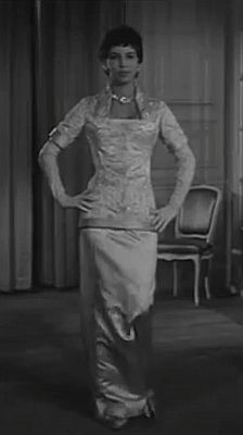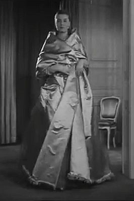 Dior was an expert at this sort of thing. Regard below a sequence of stills from another fashion show of the early 1950s. Dior, of course, mandated the 'nipped in' waist and produced the corsets and girdles required to achieve this, but his dresses in sumptuous satin, the elaborate coats in lustrous, weighty satin, the hobbling effect of the long skirt and the knowledge that the woman was ever so tightly confined in (presumably) a satin girdle were a fetishist's dream.