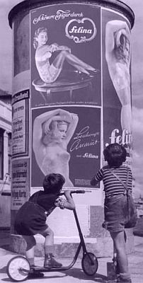 At what age this fascination begins and what triggers it is a mystery to women, and often a mystery to the men who find an irresistible attraction for female underwear. How many corsetieres receive orders whose measurements are obviously designed for a man? How many corsetieres have been approached by clients worried or disturbed by their sons' behaviour? I knew one women who discovered that her teenage son had been trying on her girdles. In all other respects the young lad was a normal, healthy youth who played football and had many friends. He had the normal adolescent curiosities, however, in this one respect, his curiosity had been extended into reality. When challenged by his mother, the youth had become very embarrassed and defensive, and the topic became a forbidden area of conversation. The lady didn't know what action to take. Revealing her son's secret passion to her husband would have resulted in a violent scene, which could as easily exacerbate as cure the problem. Perhaps he would grow out of it? Hoping that the latter would be true, she offered one of her less favourite girdles as an olive leaf of truce. She was surprised when the garment was rejected because it didn't have any satin panels. Unfortunately, her most expensive girdle was her son's favourite. Once again, the confinement of the girdle, and the feel of heavy satin must be extremely powerful stimulants to the male. My colleagues have suggested that an only child may be more susceptible to the emotions described above, however, there are numerous documented cases of young, adolescent males interfering with their elder sister's underwear. The classic cartoon depicted at the top of the page is based on fact. There is a very fine dividing line between the naughty mocking of one's sister's elaborate underpinnings, and a desire to investigate those same underpinnings further. In fact, the more overt and 'macho' the mocking, the more dangerously close does the youngster stray towards that line. A letter recently received is a personal account of this desire. Another instance that I shall recount here, for it contains all the elements that I have so far mentioned, was the extraordinary behaviour of a teenage boy who was caught by his mother wearing an incredible assortment of her own, her mother's and his sister's cast-off attire. The hugely embarrassed boy was wearing no less than three satin bridesmaid's dresses, each layer secured by one of her old girdles. Underneath it all was the crushing embrace of his granny's old surgical corsets. Apparently, he had collected a veritable wardrobe of cast off clothes and underwear from the female family members, and loved nothing better than to cocoon himself in the embrace of these quintessentially female garments. An appalling scene followed, however, the mother, recovering from her shock, returned to her son and tried to fathom his strange desires. In fact, he had as much clue as to the root cause of his compulsion as did his mother, however, he promised not to repeat his actions and ended up a happily married man with three children. The only evidence of his underlying desires, and this came from the man's wife, was that he liked her to wear satin and was disappointed when she stopped wearing girdles in the mid-1970's. The confinement, the satin and the cocooning appear classic stimulants. Psychologists suggest that the secrecy, and a latent desire to be caught all play a part in this fantastical world. [Remember the adverts in the London underground of female underwear? On the right, Felina in Germany may have inadvertently influenced any number of young men.] |