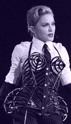 Jean-Paul Gaultier seems to understand the attraction of structured underwear as his perfume bottles reveal, however, the costume (left) that Madonna wears combines the white shirt and underwear in a cleverly provocative style. On the right, a traditional bra and girdle are constructed to imbue the maximum erotic effect. |