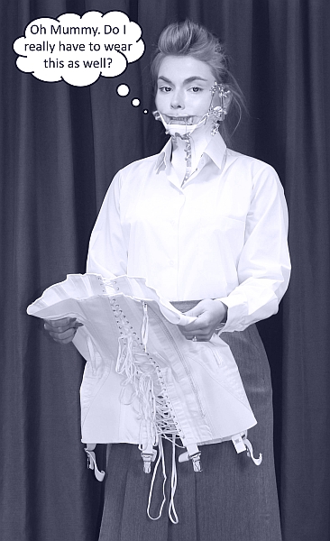 I've received a number of enquiries about 'severe' corsets with the recurring theme of a young woman (normally about late teenage) apparently under the strict control of her Mother having to wear unreasonably tight, long or heavily boned corsets (see below). I know of no such instances since the last war where any girl was persuaded to, or even could be persuaded to wear corsets against her wishes. Certainly, young women in those days habitually wore far stronger foundations than their peers of today and I've mentioned many times throughout these pages that corsets were worn (infrequently) by teenagers for special events even in the 1970's. However, what defines confinement is highly subjective as the following example demonstrates. A family (in the 1970's) was taking a cruise of several weeks duration. Father observed Mother unpacking and arranging their daughter's underwear, in particular a long-legged pantie-girdle of quite severe construction (something like a Spirella Coppelia 51 or perhaps the Charis panty-girdle). The Father was horrified that his daughter was confined in such things. This hardly constitutes a severe corset, although by today's standards, they possess a strength completely unknown to the average woman. Perhaps, Doreen Caldwell who wrote the utterly charming book, 'And All was Revealed' (1981), sums it up. "It was curious that girls who appeared to us all as fearless Dianas, even Amazons, should have crushed themselves into such constricting garments." I believe that the key word here is "constricting" and that this has much to do with the fetish aspect of corsetry in general.