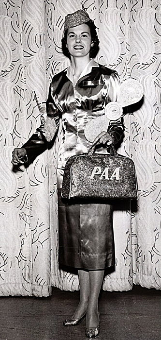 Many manufacturers, particularly before the era of the salaried women, appealed strongly to whatever would influence the loosening of the husband's wallet. Berlei (left) went straight for the jugular with this image, ostensibly advertising the Maidenform Brassiere, but blatantly using the satin skirt and top as a male attractant. My husband instantly remarked on this when he first saw the picture, and later was unable to describe the brassiere in any detail at all. And as for the Pan-American advertisement (right), somebody somewhere in the marketing department (and you can bet that it would be a man) had a seriously strong understanding of what would rip a man's eyeballs from their sockets! Satin, a woman in uniform and a white blouse are assembled here to devastating effect.