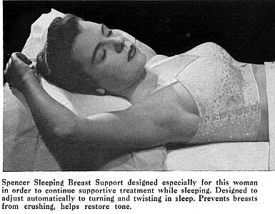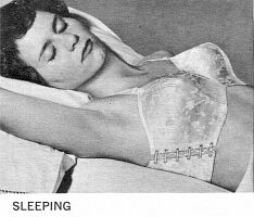 Sleeping in one's corsets is another not uncommon fantasy that is entertained by some correspondents. But in this case, it does happen in reality. I have known several women who have slept in their corsets. Invariably they have serious back problems, and however hard the bed, a firm corset for the night-time can give tremendous relief. The lady pictured on the right is featured in Spencer's "Advice to Doctors: 1953". The poor lady in question had a bad back following pregnancy and was quite incapacitated until fitted with these corsets. She wore them night and day for five months and were described as "quite comfortable to sleep in".
