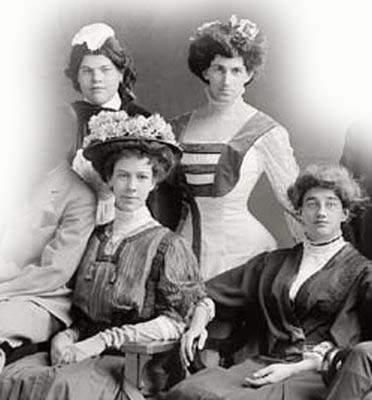 Most of these women seem to be at ease with their neckwear although the girl at the top right is less sure.